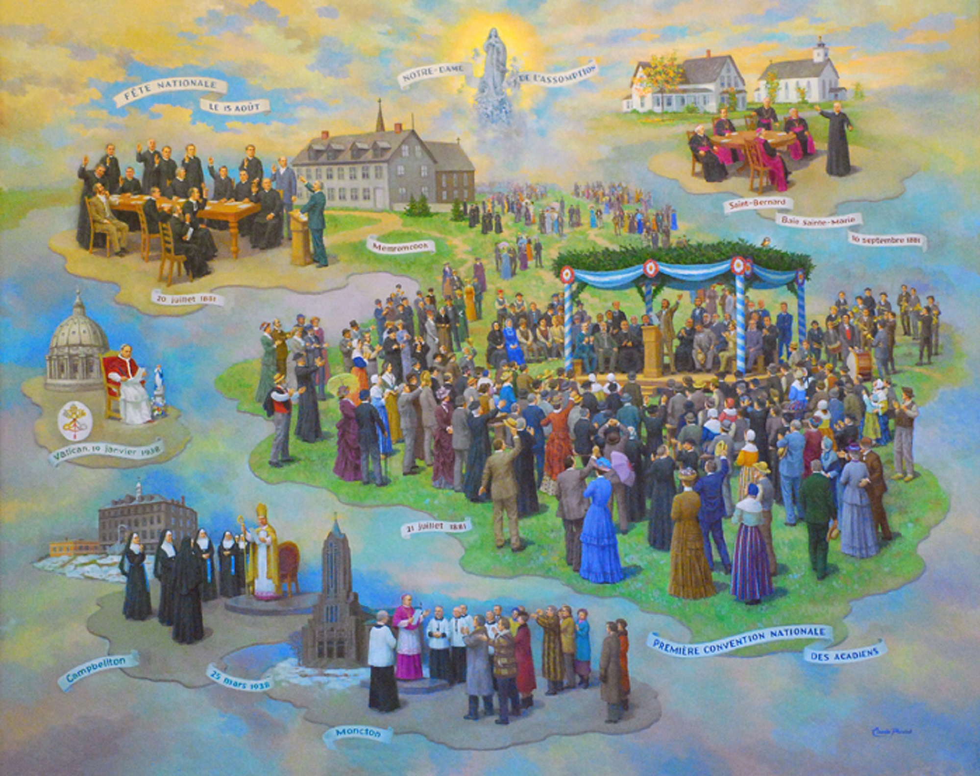 Malgré tout, l’histoire de notre fête nationale nous rappelle qu’il n’y a jamais de grande décision historique unanime. L’année 1881 restera marquée comme la date où les Acadiens décidèrent de s’unir et de partager un destin commun. Cette décision sera suivie quelques années plus tard, en 1884, par le choix des symboles nationaux, dont le drapeau et l’hymne national. Plus de cent ans plus tard, tous ces symboles continuent à rassembler les Acadiens du monde entier pour célébrer ensemble notre héritage et nos accomplissements.