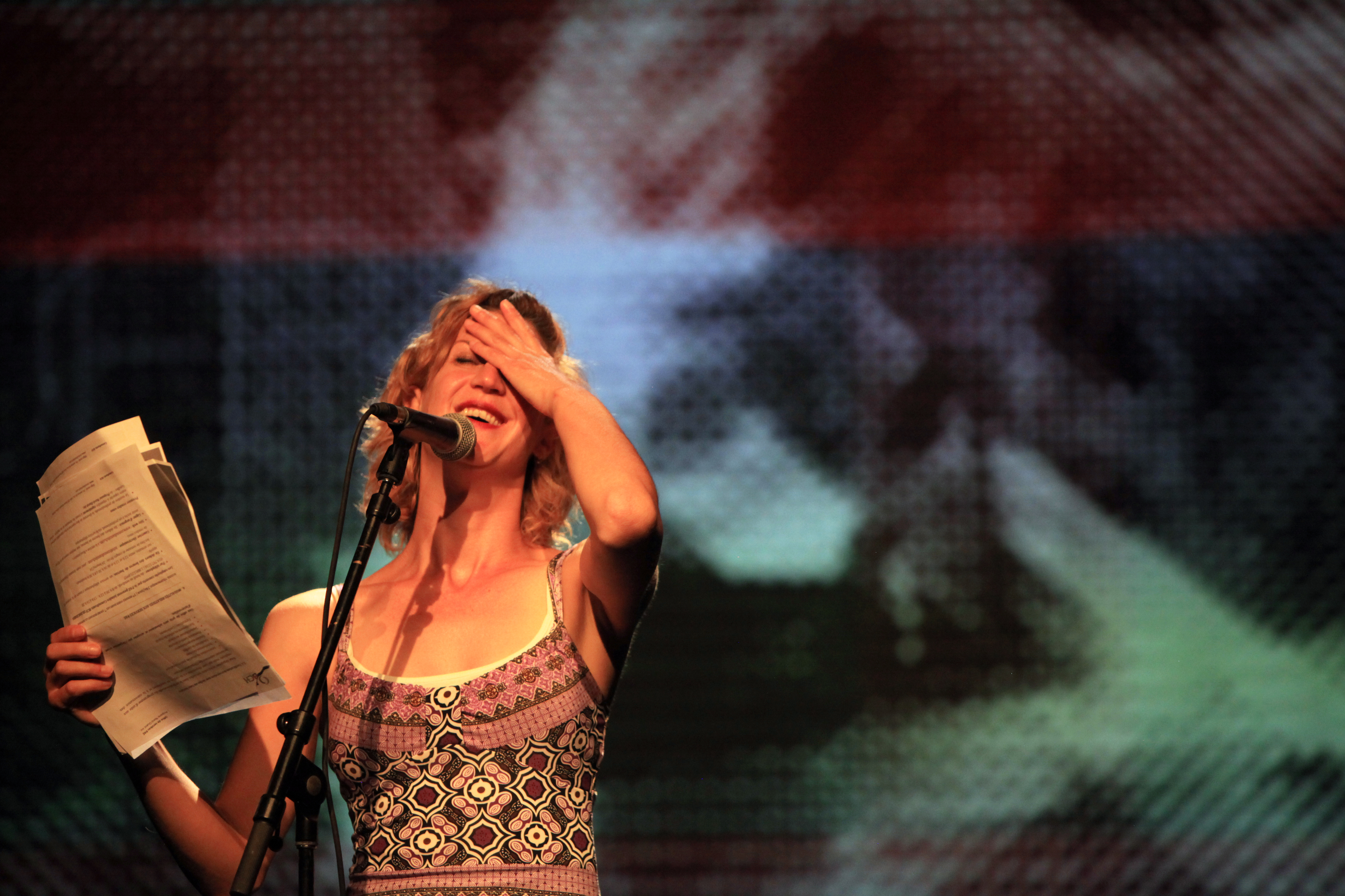 Peu de temps après, Gabriel Robichaud clama haut et fort son poème percutant intitulé « À cause que », les pages s’envolant au rythme effréné de l’énumération constante des « à cause que » : « à cause que Moncton n’est pas seule », « à cause que la Baie des Chaleurs est un mensonge », « à cause qu’on fait pas fucking pitié », « à cause que l’Acadie est une freak de l’histoire »… Par la suite, Sonia Cotten, en réponse à Robichaud, répliqua : « à cause que je viens de l’Abitibi / à cause que ça me dérange pas! ». Elle partagea par la suite un poème (ou plutôt une prestation!) intitulé « Zombie bisou », s’inspirant de la série télévisée The Walking Dead.