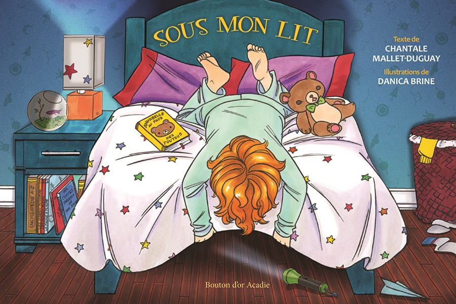 - Duguay Mallet, Chantal [texte] et Danica Brine [illustrations]. Sous mon lit, Moncton, Bouton d’or Acadie, 2013, 28 p.