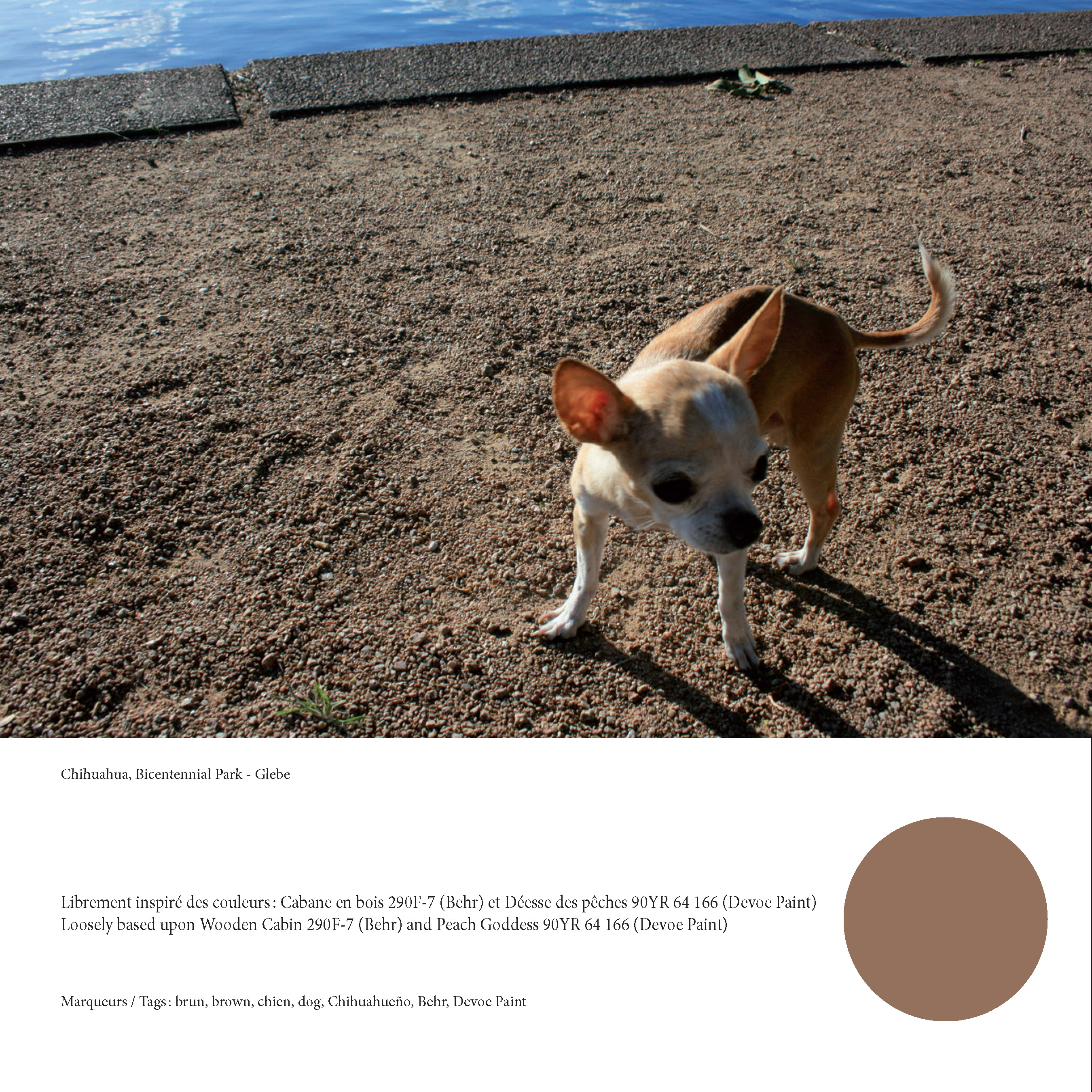 Dugas explore toutes les possibilités que lui offrent les couleurs écrites. « Chihuahueño » (p. 51), le poème le plus ludique du recueil, devient presque inintelligible, sinon surréaliste. Le poète trace le portrait d’« un petit chien tout à fait adorable » à l’aide des noms de couleurs inventés par différentes compagnies de peinture. Si l’on avait à recomposer le portrait pictural de l’animal d’après ce texte, le chihuahua se métamorphoserait drastiquement : « Tamia rayé autour des cheville / Cabane en bois sur les côtés / un peu de Moineau sur le visage / Peau de mouton sur sa tête / un soupçon Déesse des pêches / un grain de Vacher là-haut / sans oublier les incontournables / Sucre d’érable / Maison d’écorce Mark Twain. » Toutes ces expressions pour dire les différentes nuances compromettent l’image, la recréent, ouvrent l’imaginaire du lecteur. Le poète montre ainsi que « [le mot] est porteur de fictions, de fabrication imaginaires » (p. 9).