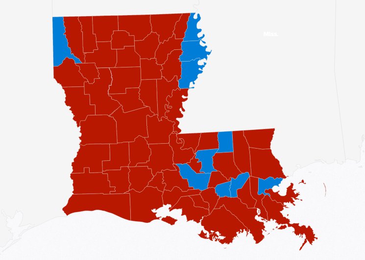 Résultats du scrutin présidentiel du 8 novembre 2016 dans chaque paroisse (comté) de la Louisiane. En rouge, les résultats de Trump et en bleu, les résultats de Clinton.