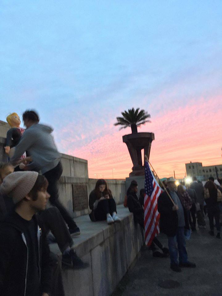 En nous servant de notre langue comme d’une arme et d’un bouclier, nous faisons d’elle une représentation de notre culture, de notre héritage et de notre identité – progressistes et traditionnelles à la fois. Le monde peut penser qu’il n’y a pas un tas de résistance ni de malaise politique icitte en Louisiane, car la plupart des gens de l’extérieur nous tiennent pour des couillons, rouge-républicain comme autant d’écrevisses cuites. La vérité, c’est qu’il y a bel et bien un mouvement de résistance icitte en Louisiane, même s’il se produit surtout sur l’île bleue de La Nouvelle-Orléans. Le lendemain des élections, au soir, des centaines de personnes se sont retrouvées Place Lee Circle. En l’espace de quelques heures après ce rassemblement, des images de celui-ci furent diffusées un peu partout dans les médias sociaux.