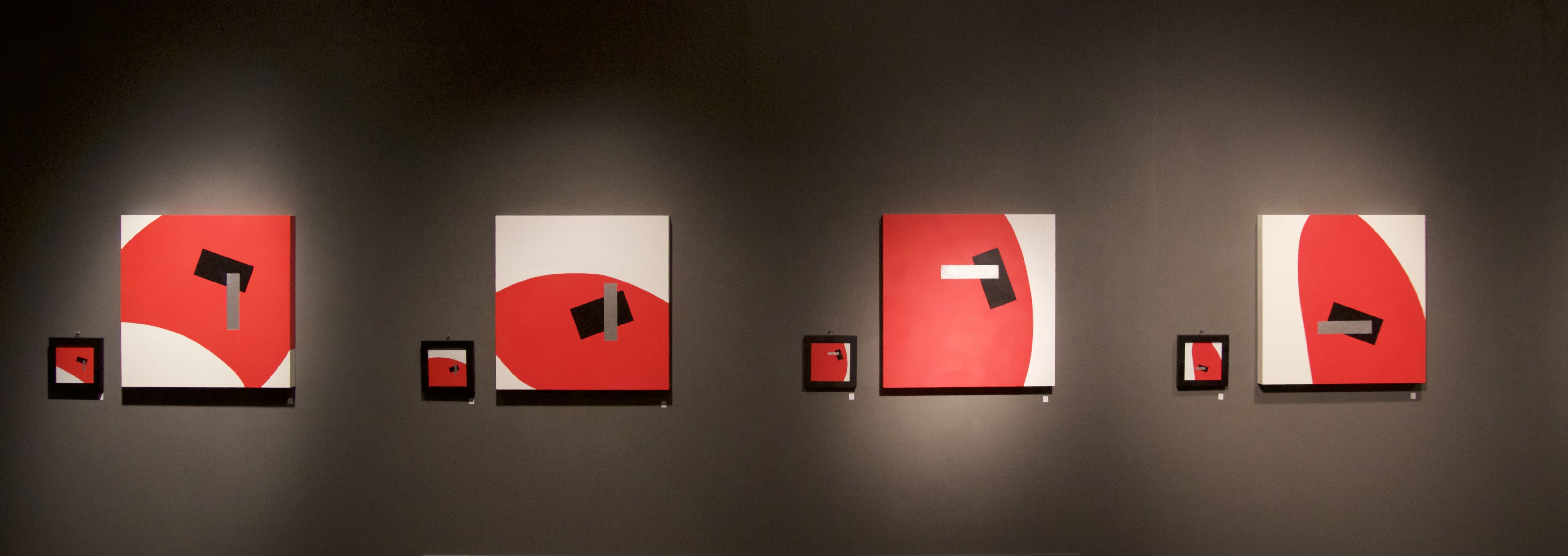 L’exposition commence par des études et plus particulièrement par une première série de tableaux aux formats identiques et aux matières contrastantes : le bois naturel, le noir en aplat, le fini métallique. Dans chaque tableau une forme abstraite est posée sur un fond, y flottant ou y traçant une trajectoire. Cette série de propositions disparates est suivie sur le même mur d’une petite oeuvre solo, «Souvenir bleu de Kandinski», là où forme et fond fonctionnent véritablement de concert. Cette petite oeuvre apporte un point final à la suite décousue qui la précède; elle amène le regardeur à considérer la pertinence de construire la composition de l’œuvre en tenant compte de l’aire du support.