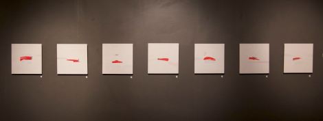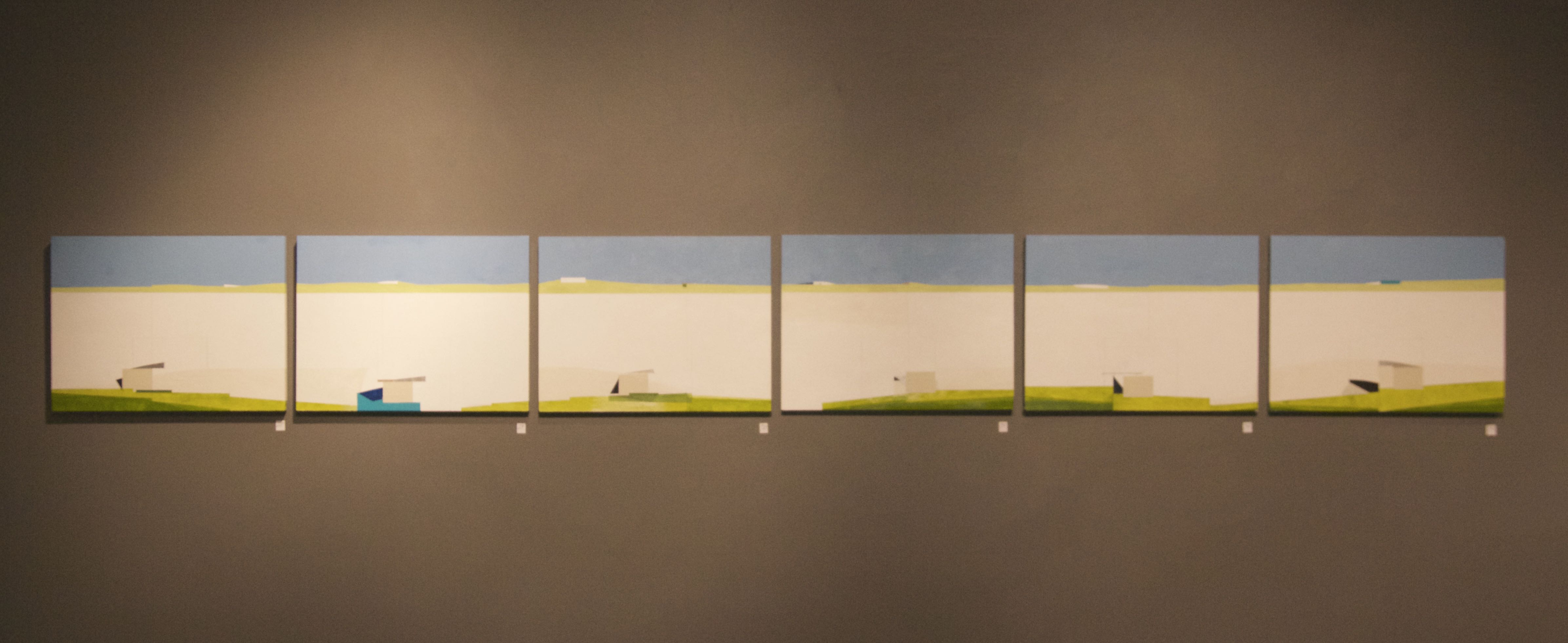 Deux séries de petits tableaux semblent raconter chacune leur histoire. Une suite de six peintures aborde le lieu tel un paysage immense dans lequel s’insère une construction comme un bijou sur la peau : des surfaces animées, une pointe comme un bec, un auvent comme une aile. Ce travail, conjugué différemment dans «Maisonnette vu de Caraquet» ou «Sur la plage de l’Église», nous parle de l’habitat implanté dans un environnement naturel, aperçu au loin, quand la vue est panoramique. Dans l’autre série, l’artiste traite des sensations mouvantes associées aux caractéristiques naturelles du lieu, évoquant une baleine aperçue en bord de mer, comme une charge émotive qui vient influencer l’approche formelle. De ces sept petits tableaux, dont «La baleine rouge» et «Le harpon», tous évoquent la vision furtive et indistincte d’une masse en mouvement faisant corps et contraste avec le fond lumineux d’où elle surgit.