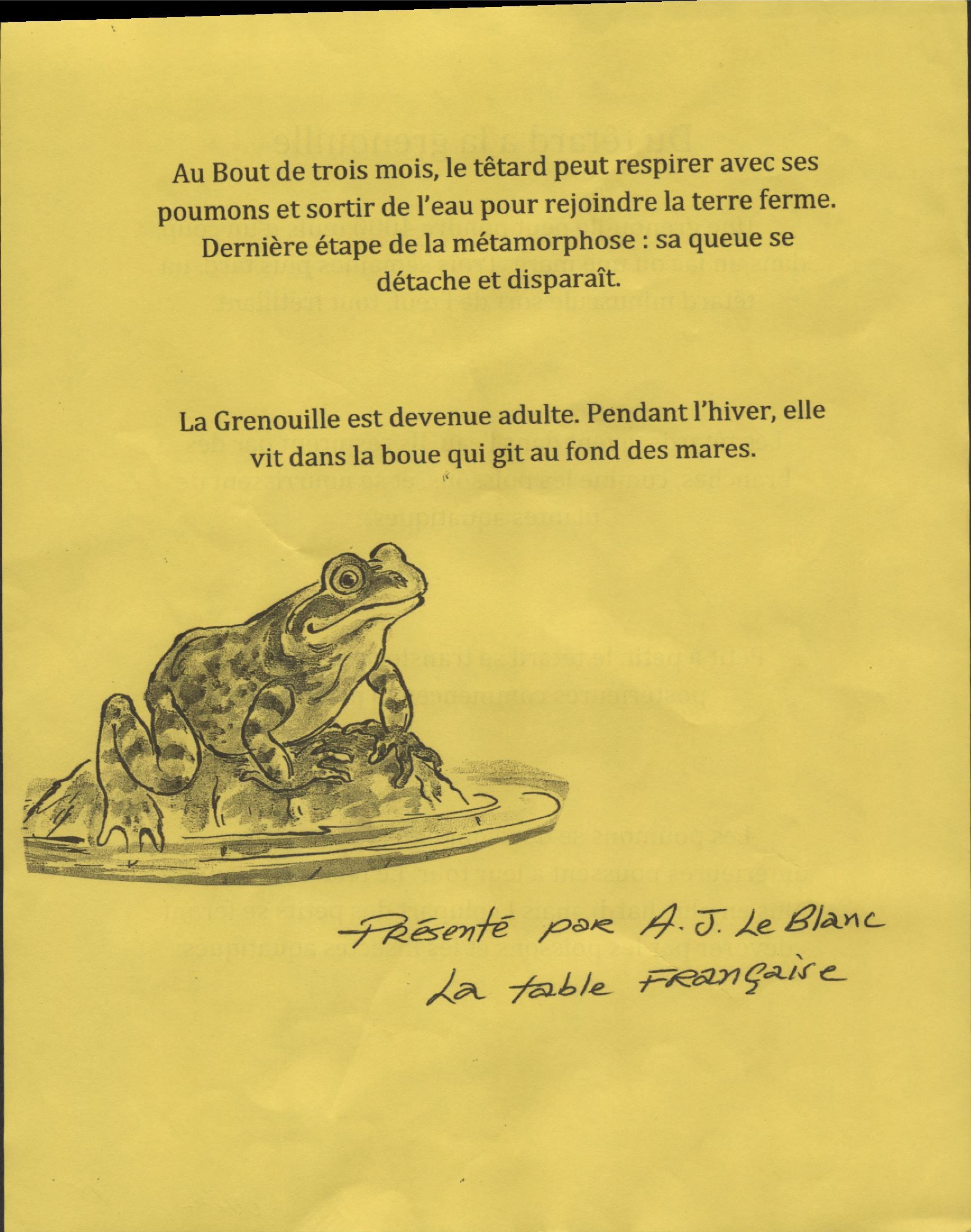 Un ami de la Paroisse d’Acadie m’a suggéré la table française de Rayne, petite ville connue pour ses grosses grenouilles comestibles – et tout proche en plus. Mes expériences ici me rappelleraient l’avertissement de mon professeur concernant mes attentes. Les participant(e)s étaient âgé(e)s, tou(te)s Cadien(ne)s, et tout le monde se connaissait. Tout cela était attendu, voire souhaité. Ce qui m’aura quelque peu surprise, c’étaient la structure et le contenu de ces rendez-vous.