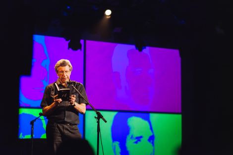 Au Lion d’or ce soir-là, dans l’ambiance feutrée du cabaret, le public était exactement ce à quoi l’on pourrait s’attendre de gens s’étant déplacés pour assister à un spectacle de poésie : modeste, mais remplissant suffisamment la salle; sage, mais enthousiaste; posé, mais chaleureux. Le spectacle commence alors doucement avec une présentation de Chiasson qui défait gentiment la figure autoritaire du poète national pour laisser la poésie prendre l’avant. On comprend que le spectacle reprendra studieusement, mais avec une pointe de ludisme, le format de l’abécédaire. Ce sera bel et bien Herménégilde Chiasson de A à Z comme l’indique le titre du spectacle, qui comprend 26 vignettes : A comme Ange, B comme Bleu, C comme… et ainsi de suite.