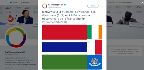 La nouvelle est arrivée, comme il se doit de nos jours, dans un Tweet : «@OIFfrancophonie. Bienvenue à la #Gambie, à l’#Irlande, à la #Louisiane (É. U.) et à #Malte comme observateurs de la Francophonie! #SommetEVN2018.». Depuis que le dossier de candidature fut posé en avril, on attendait avec impatience son acceptation. Je n’avais pas de vraies craintes qu’on soit rejeté, mais comme l’histoire de la Louisiane francophone est remplie de rendez-vous manqués, l’ombre du doute planait quelque part au fond de mon esprit.