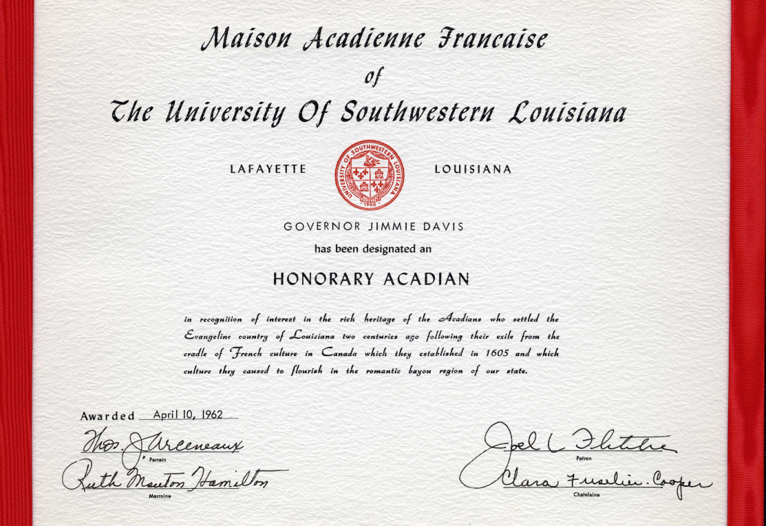 À titre d’exemple, ce certificat d’Honorary Acadian a été décerné à Jimmie Davis, deux fois gouverneur de la Louisiane et auteur de chanson «You Are My Sunshine». Center for Southeast Louisiana Studies, Fonds Jimmie-Davis, boîte 3, doc. 6.