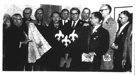 De passage au Musée acadien de l’Université de Moncton, la délégation lafayettoise fait cadeau du drapeau de l’Acadiane, crée en 1965 par Thomas J. Arceneaux sur la suggestion d’Allen Babineaux (3e de la droite), derrière qui se tient le maire de Lafayette, J. Rayburn Bertrand (4e de la droite). L’Évangéline, 13 mars 1972.