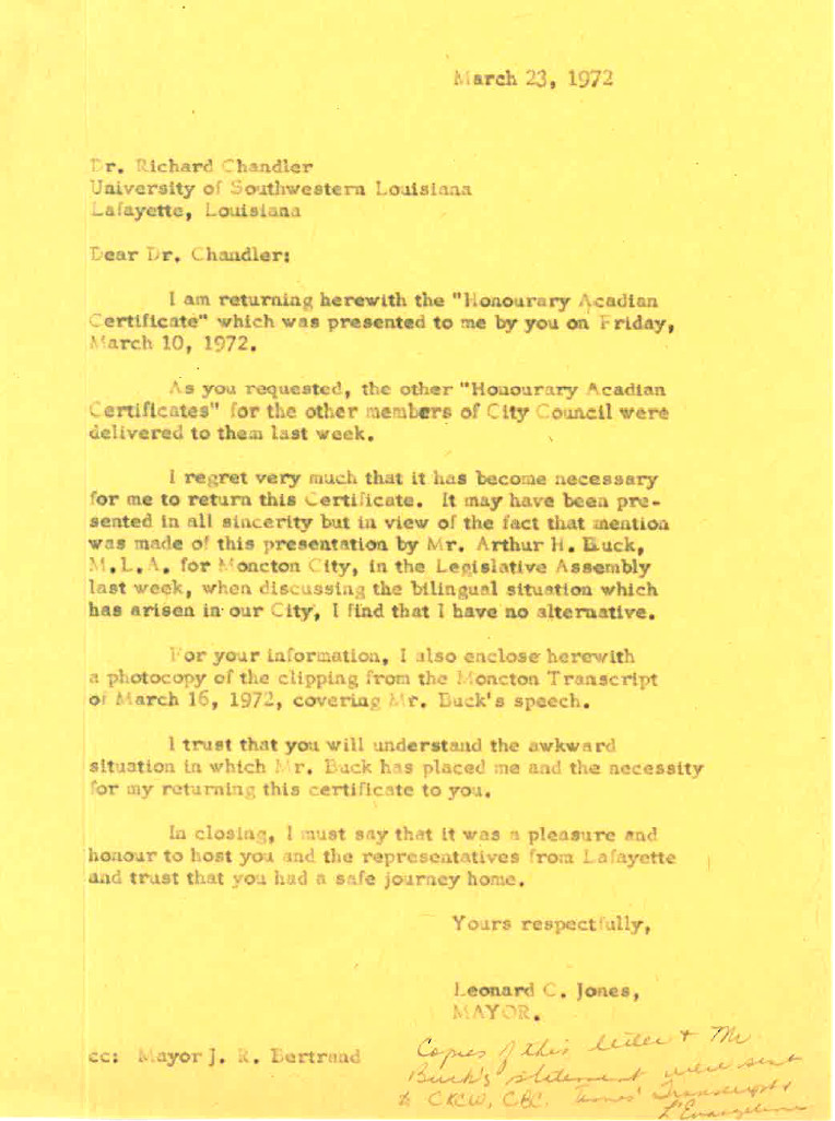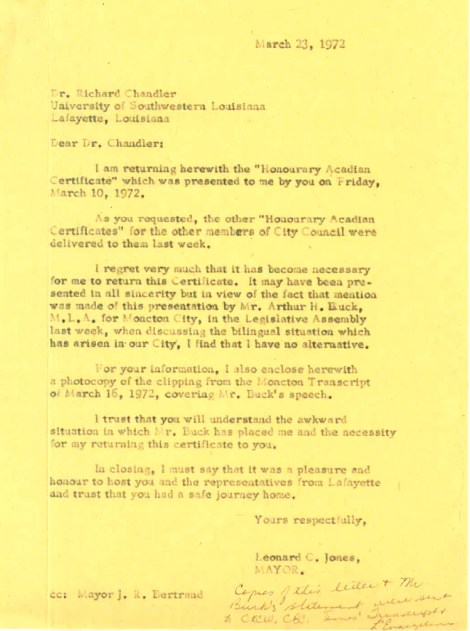 Suite à l’adoption d’une entente d’amitié par les deux conseils municipaux, à l’automne 1971, une délégation venue de Lafayette décernait au maire et à d’autres édiles municipaux, lors d’un banquet au Brunswick Hotel, des certificats de Honorary Acadian, de la part de la Maison Acadienne-Française de l’Université du sud-ouest de la Louisiane (USL). Quelques jours plus tard, le maire Jones retournait son certificat. Dans le contexte des débats enflammés sur le bilinguisme, prétendait-il, il lui était impossible d’accepter un tel signe de reconnaissance symbolique. Son geste provoquait ainsi un petit embarras diplomatique qui semble avoir été à peu près oublié par la suite.