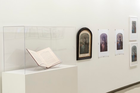 Rémi Belliveau, A Seated Girl Wearing a Cloak, 2017-2019, projet d’art-archivage, avec la permission de l’artiste, vue de l’installation, Galerie d’art Owens, 2019. Photo : Roger J. Smith.