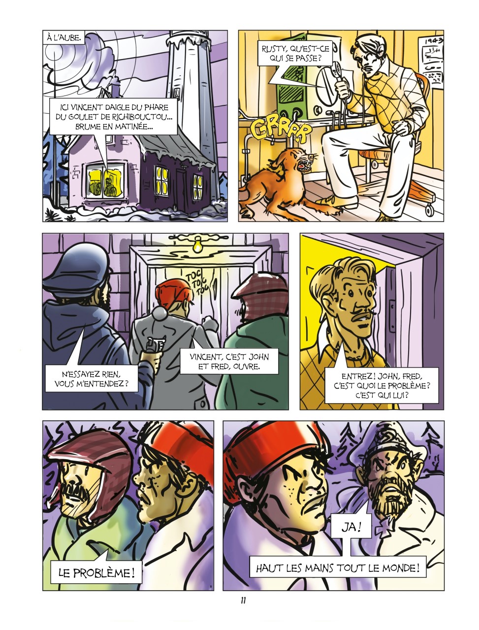 Pour un premier ouvrage de bande dessinée, Alerte à Richibouctou est un album plutôt ambitieux. Non seulement Roland Daigle a-t-il dû mener d’importantes recherches (l’historien Maurice Basque signe d’ailleurs une courte postface), mais l’auteur choisit de multiplier les points de vue. Celui-ci nous présente l’action dans plusieurs lieux à la fois, à la manière du film Dunkirk de Christopher Nolan (2017).
