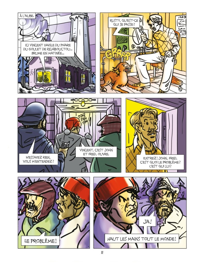 Il va sans dire que la Seconde Guerre mondiale a fait l’objet d’un nombre incalculable d’ouvrages de bande dessinée (dans la sphère anglophone, les war comics constituent un genre en soi). Aussi, l’album de Roland Daigle n’est pas sans rappeler L’Espion de trop de Frédéric Antoine et VoRo (Glénat Québec). Parue également en 2019, cette bande dessinée est librement inspirée d’un autre épisode de la «bataille du Saint-Laurent» : l’arrestation, en novembre 1942, de l’espion allemand Werner von Janowsky à New Carlisle, en Gaspésie[6].